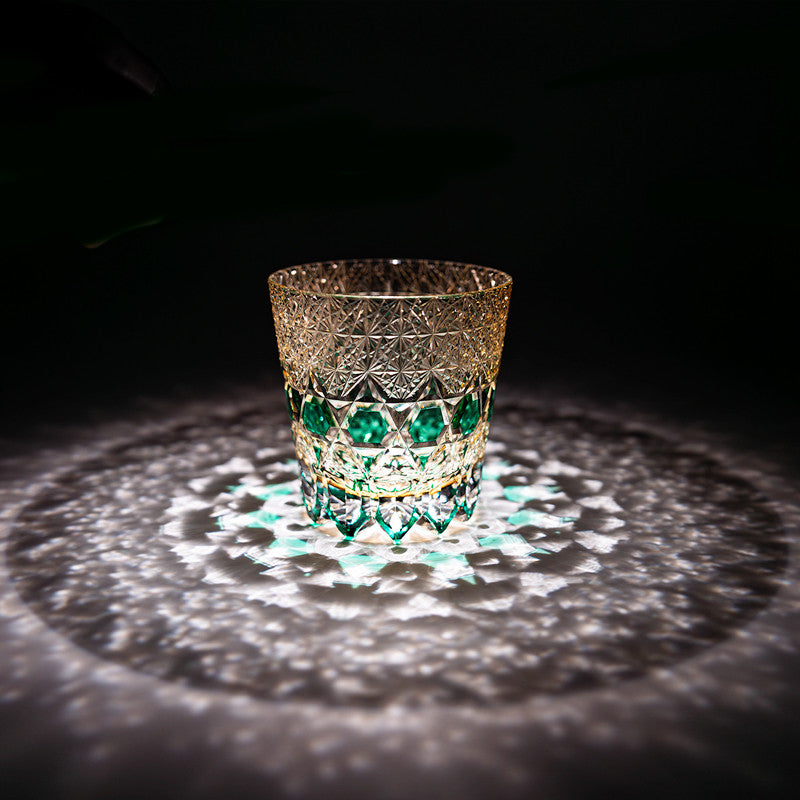 Inspired by the mesmerizing refraction of light through a prism, the vibrant green hues of this glass come alive as they interact with light, creating a dazzling play of colors. The intricate Edo Kiriko cut patterns—a centuries-old Japanese glass-cutting technique—add delicate texture and sophistication, while the smooth, refined lines ensure a comfortable grip.