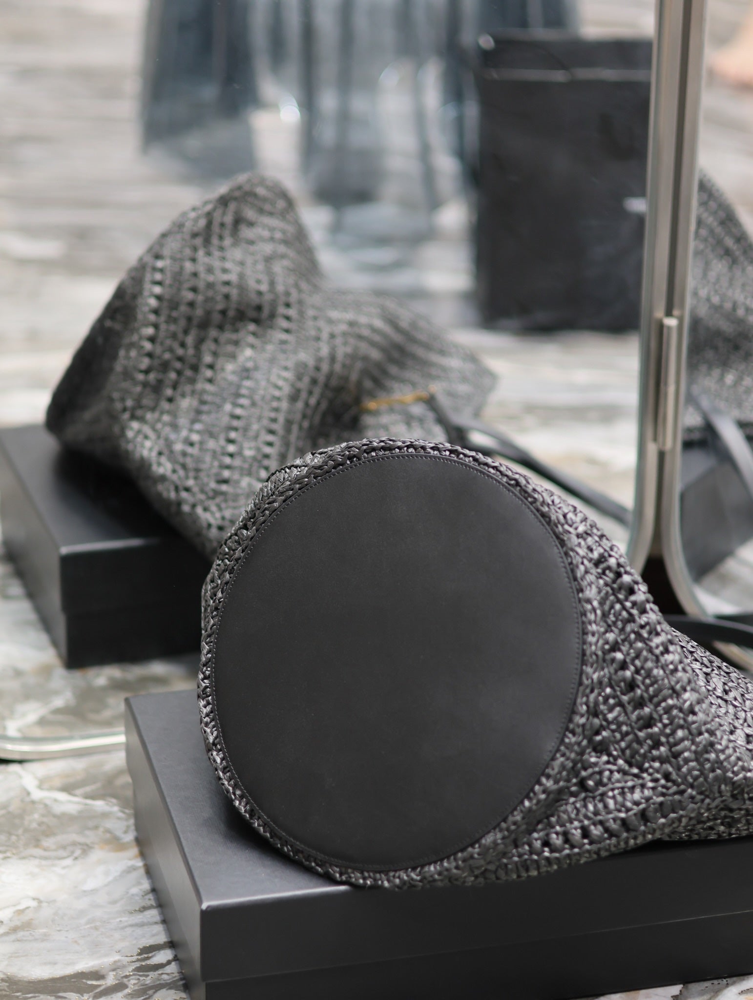 YSL PANIER MEDIUM IN RAFFIA AND VEGETABLE-BLACK LEATHER